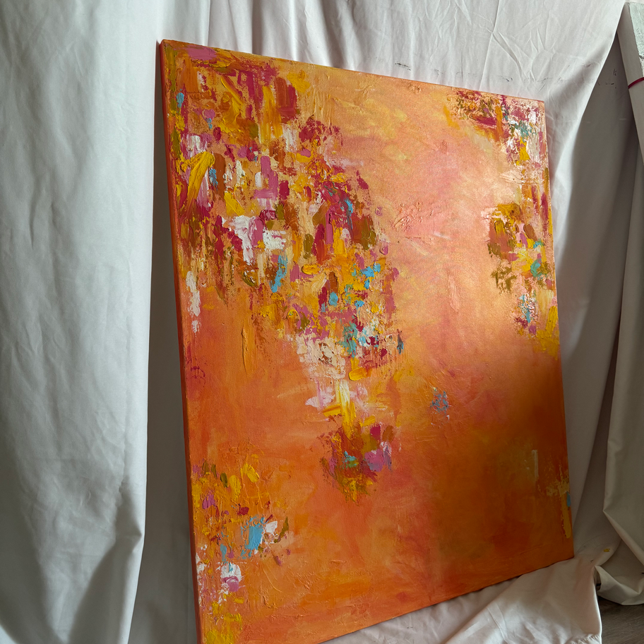 A textured burst of color and movement — this piece evokes warmth, spontaneity, and creative joy through layered strokes and sun-kissed tones.