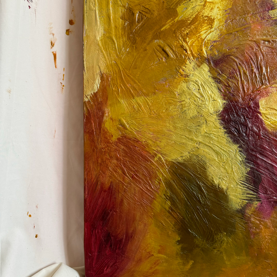 Solset unfolds in textured golds and deep rose. A quiet explosion of warmth—glowing, vanishing, eternal.